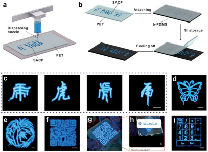 SACP材料提供的稳定可逆的界面粘附,使得器件可以实现重复的组装、拆卸、重构:EL器件可以在经过1000次重复拆卸和重新组装后仍保持其初始亮度的81%。此外,SACP材料的前驱体溶液与多种涂覆和印刷技术兼容,如旋涂、喷墨印刷、点胶和转印等(图2a和b)。借助这些印刷技术,研究团队展示了一系列高分辨率的图案化交流电致发光器件,用于显示不同的内容(图2c-i)。