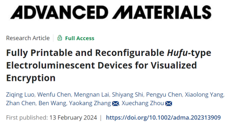 Z. Luo, W. Chen, M. Lai, S. Shi, P. Chen, X. Yang, Z. Chen, B. Wang, Y. Zhang*, X. C. Zhou* Fully Printable and ReconfigurableHufu-type Electroluminescent Devices for Visualized Encryption. Adv. Mater. 2024, 2313909. https://doi.org/10.1002/adma.202313909