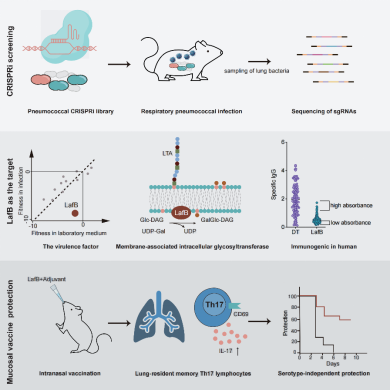 在本研究中,刘雪等特别寻找了在超级感染期间对细菌生存至关重要的保守基因,发现了lafB基因,该基因编码一种高度保守的,定位于细胞膜的蛋白,且其对细胞壁稳态至关重要,是肺炎链球菌引起感染的必需基因。进一步地,研究者发现LafB蛋白可以针对超级感染提供广谱的免疫保护。免疫保护作用机制的相关研究发现,LafB蛋白免疫小鼠之后可以诱导具有肺部组织驻留特性的Th17细胞的免疫响应,且该响应是免疫保护所必需的。这种广谱的Th17依赖的免疫保护机制为开发一种通用的、不依赖于血清型的肺炎链球菌疫苗铺平了道路。