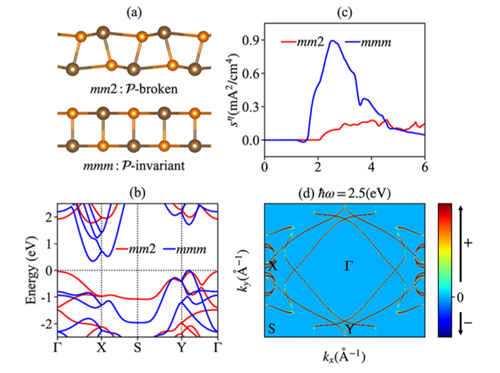 王健教授等利用非线性响应理论,发展了绝缘体中二阶直流散粒噪声的量子理论,将二阶光电流算符分成非对角和对角两部分,分别得到了位移和注入两种直流散粒噪声。通过对称性分析,发现两种二阶直流散粒噪声不受空间反演对称性限制,可以出现在中心对称的量子材料中。本文研究发现,二阶直流散粒噪声和量子材料的量子几何张量(包括贝里曲率和量子度规)密切相关。最后,本文将发展的散粒噪声理论和第一性原理计算相结合,预测了二维材料GeS和MoS2中的二阶直流散粒噪声。计算结果显示,GeS的中心对称相(mmm)中二阶直流散粒噪声强于其非中心对称相(mm2),如图1所示。