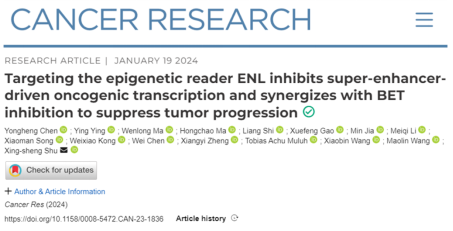 近日,乐竞平台医学部基础医学院舒兴盛和应颖团队合作在《Cancer Research》杂志(影响因子11.2,中科院1区TOP,自然指数期刊)上发表了题为“Targeting the epigenetic reader ENL inhibits super-enhancer-driven oncogenic transcription and synergizes with BET inhibition to suppress tumor progression”的研究论文。该工作以结直肠癌为模型刻画了组蛋白乙酰化阅读器ENL(eleven-nineteen leukemia)在实体肿瘤中的促癌生物学功能并发现抑制或降解ENL可增敏靶向超增强子(super-enhancer, SE)的表观遗传药物BETi(BET inhibitor),揭示了ENL在控制SE驱动的致癌转录中的重要作用,提出通过干预ENL增强肿瘤对BETi敏感性的新策略。舒兴盛副教授为该论文通讯作者,医学部研究生陈永恒,应颖教授、马文龙副研究员和研究生马宏超为共同第一作者,乐竞平台为第一完成单位。