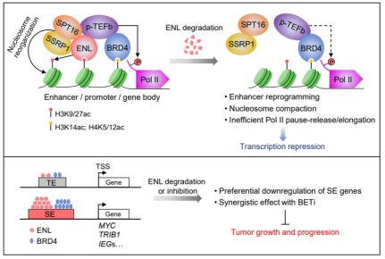 该研究首先通过肿瘤细胞的BETi敏感度与基因依赖程度的相关性筛选,得到含YEATS结构域的组蛋白乙酰化阅读器ENL这一可能影响BETi敏感性的表观遗传因子。研究人员发现在不同来源的肿瘤细胞中绝大多数SE都被ENL占据,其结合的偏好程度远高于普通增强子,而且ENL在SE上的富集依赖于它结合乙酰化组蛋白的能力。利用植物生长素诱导降解标签标记内源ENL基因,研究人员发现在肿瘤细胞中诱导ENL蛋白的急性降解可强烈抑制SE控制基因的转录,如经典癌基因MYC,而恢复ENL蛋白表达可很大程度上逆转这些效应。机制上,ENL与组蛋白伴侣FACT (FAcilitates Chromatin Transcription)复合物相互作用,是FACT招募到包括SE在内的顺式调节元件的必要条件,而FACT则可能介导转录启动和延伸所需的核小体重构。更重要的是,ENL-FACT复合物对转录的控制受BRD4的调节。在结直肠癌中,ENL的过度表达与肿瘤的生长、转移及较差预后密切相关,靶向降解或抑制ENL能与BETi协同抑制结直肠癌的生长。