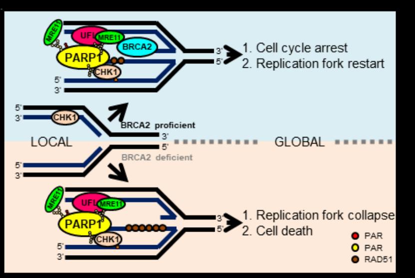 基因组DNA的高保真复制和合适的DNA复制胁迫应答是维持基因组稳定性和细胞增殖的根本保障,其异常与大多数肿瘤的发生和发展密切相关,因此,其调控网络也是肿瘤治疗的核心靶标。作为2004年才被发现的最新型类泛素修饰—UFM1修饰,至今被发现的修饰底物非常有限,却已被证明在胚胎发育、内质网稳态、蛋白质量控制、DDR等生命活动中起重要作用,然而在DNA复制胁迫应答中的功能尚有待挖掘。在该研究中,许教授团队发现UFM1修饰缺陷导致复制胁迫子下被阻滞的复制叉不稳定和染色体畸变率显著升高,进一步发现多聚(ADP-核糖)聚合酶PARP1的548位赖氨酸(K548)发生UFM1修饰,该修饰促进PARP1的酶性活化和在复制叉上的招募、细胞周期检验点激酶CHK1的激活和核酸酶MRE11到被阻滞复制叉的招募,进而促进BRCA1/2缺陷细胞中核酸酶MRE11对被阻滞复制叉的降解,而在BRCA1/2正常细胞中促进被阻滞复制叉重启,维持基因组稳定。肺癌病人的肿瘤细胞突变PARP1(F553L)展现出与UFM1修饰缺陷PARP1(K548R)相似的细胞表型。该研究成果揭示了UFM1修饰维持被阻滞复制叉稳定和基因组完整的作用机理,为基因组不稳定相关疾病的诊治提供了新的潜在策略。