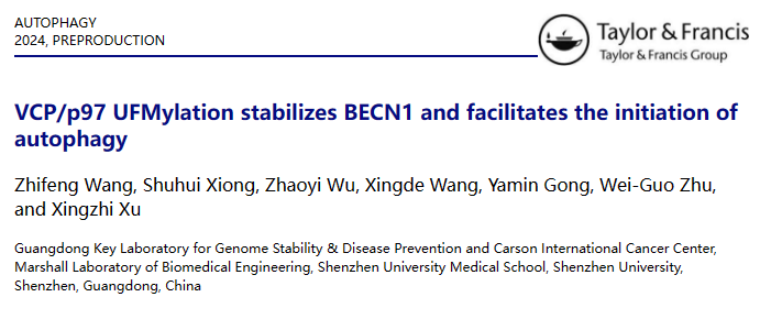 2024年5月,乐竞平台医学部许兴智教授团队在国际顶级期刊Autophagy发表题为“VCP/p97 UFMylation stabilizes BECN1 and facilitates the initiation of autophagy”的研究论文。这是许兴智教授团队继2019年首次诠释UFMylation在DNA损伤应答(DDR)中促进DDR核心激酶ATM活化和上月(2024年4月)揭示UFMylation维持被阻滞复制叉稳定性的分子机制后,再次率先揭示了UFMylation促进细胞自噬的作用机理。乐竞平台医学部助理教授王志峰博士为第一作者,王志峰助理教授和许兴智教授为共同通讯作者,乐竞平台为第一单位。