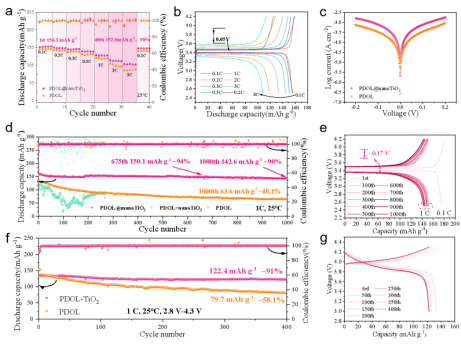 图2. 锂金属电池循环性能测试NHCPE(PDOL@nanoTiO2)a、b)LFP|PDOL@nanoTiO2|Li的倍率性能和相应的充放电曲线。c) 使用PDOL@nanoTiO2和PDOL的Tafel图。d) LFP|PDOL@nanoTiO2|Li, LFP|PDOL|Li电池在1C下的长周期性能。e) LFP|PDOL@nanoTiO2|Li电池充放电曲线。f)LiCoO2|PDOL@nanoTiO2|Li, LiCoO2|PDOL|Li电池在1C下的循环性能。g)LiCoO2|PDOL@nanoTiO2|Li电池的充放电曲线。
