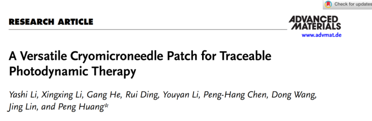 近日,乐竞平台医学部生物医学工程学院黄鹏特聘教授团队在国际顶级学术期刊Advanced Materials(影响因子29.4,中科院一区,TOP期刊)上发表了题为《A Versatile Cryomicroneedle Patch for Traceable Photodynamic Therapy》的研究论文。这项研究的所有工作均在乐竞平台完成,该团队研究助理李雅诗、研究生李星星和博士后贺港为论文共同第一作者,黄鹏教授为唯一通讯作者,乐竞平台为唯一通讯单位,该团队所在的生物医学工程学科属于广东省优势重点学科。