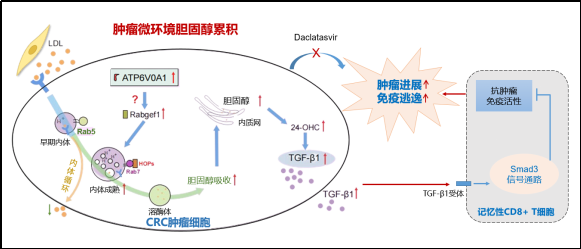 肥胖已经成为一个全球性的健康问题。越来越多的证据表明,肥胖可以通过脂质代谢重编程来抑制抗肿瘤免疫反应。然而,癌细胞如何利用肿瘤微环境中的胆固醇驱动其代谢重编程,促进免疫逃逸的作用和机制尚未阐明。该研究首次发现结直肠癌细胞异常高表达的ATP6V0A1通过RABGEF1依赖的内体成熟途径促进其对外源性胆固醇的吸收,导致胆固醇在内质网中累积,并进一步升高胆固醇氧化衍生物24-OHC的水平。ATP6V0A1诱导的24-OHC通过激活LXR信号通路上调TGF-β1。随后,结直肠癌细胞将TGF-β1释放到肿瘤微环境中,激活记忆性CD8+ T细胞中的SMAD3通路,最终抑制其抗肿瘤活性。此外,在基于分子对接的蛋白质-抑制剂相互作用分析中,筛选出已在临床上使用的抗丙型肝炎病毒(HCV)药物达卡他韦(Daclatasvir),可以特异性靶向ATP6V0A1并有效增强记忆CD8+ T细胞活性,抑制肿瘤生长。该研究成果不仅揭示了肥胖/高脂饮食促进结直肠癌免疫逃逸的新机制,还为结直肠癌患者的免疫治疗提供了新思路。