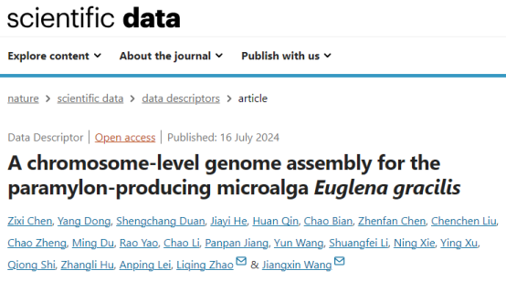 2024年7月16日,乐竞平台生命与海洋科学学院王江新教授与化学与环境工程学院赵丽青教授团队在Nature出版集团旗下期刊ScientificData(五年平均影响因子:8.9)发表题为“A chromosome-level genome assembly for the paramylon-producing microalgaEuglena gracilis”的研究论文。研究团队利用二代Illumina、三代PacBio、Bionano以及Hi-C测序技术,组装得到高质量的染色体级基因组图谱。该基因组大小约2.37Gb,包含46条染色体,contigN50为619Kb,scaffoldN50为1.12Mb,并注释到了39362个蛋白编码基因。