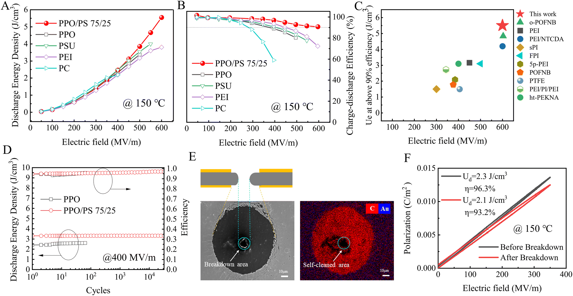 该研究是在前期工作基础上(Matter,2021,4(7):2448-2459)进行的深入拓展,旨在解决薄膜电容器在高温下漏电流急剧提升的核心科学问题。研究提出了一种低熵非晶态聚合物构筑策略。该低熵非晶态聚合物由高玻璃化转变温度的聚(2,6-二甲基-1,4-苯撑氧化物)(PPO)和聚苯乙烯(PS)分子级共混而成,在高温和高电场下表现出优异的电容性能。材料设计原理是利用PS的苯环与PPO的苯环之间的强范德华力,在分子水平上“拉伸”主链,从而显著降低非晶态聚合物的分子构象熵,形成随机取向但高度紧密堆积的延展聚合物链,通过深能级局部态抑制电荷传输。研究结果表明,该低熵非晶态介电聚合物在150℃下表现出5.5 J/cm³的放电能量密度和超过90%的充放电效率,性能优于现有的介电聚合物,并显示出放电能量密度的两倍以上的提升。此外,与其他方法相比,该薄膜加工工艺(即聚合物共混)更简单、直接且成本低,因此该方法为高性能和高质量聚合物薄膜的量产铺平了道路,这些薄膜在高温薄膜电容器中具有广泛应用。