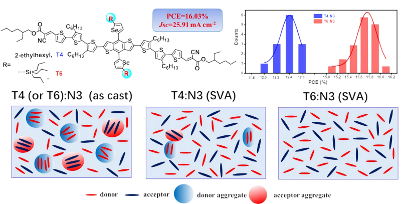 研究团队发展了两种新型小分子给体材料,分别命名为T4和T6。这两种材料在共轭硒噻吩侧链上分别引入了烷基取代基和三烷基硅基取代基。研究结果表明,不同的侧链取代基对半导体性质、薄膜形貌以及器件效率产生了显著影响。与T4相比,三烷基硅基取代的T6展现出更深的HOMO能级,并且吸收光谱略有蓝移。当这两种材料与受体N3混合时,所形成的共混薄膜表现出显著不同的性质。未经处理的器件均表现出较差的性能,但在使用二硫化碳(CS2)进行退火处理后,相应器件的光电转换效率显著提高,主要得益于更快的激子生成速率和更有利的相分离,形成了互穿纤维网络结构。特别值得一提的是,基于T6的薄膜器件实现了16.03%的PCE,明显高于T4器件的PCE(12.61%)。与T4器件相比,T6器件PCE的提升主要归因于以下几点:首先,T6纯薄膜具有更宽的吸收范围和更深的HOMO能级,可能带来更高的短路电流和开路电压;其次,T6基器件表现出更好的激子解离率和电荷收集效率,且电荷迁移率更为平衡,受复合影响较小;最后,这些共T6:N3共混薄膜显示出更强的π-π堆积效应和更有序的分子排列,以及更明显的纤维状互穿网络结构,有利于电荷传输。该研究系统探讨了侧链工程和CS2退火对半导体性质和器件性能的影响,展示了侧链工程和溶剂退火在提升光电性能方面的巨大潜力。