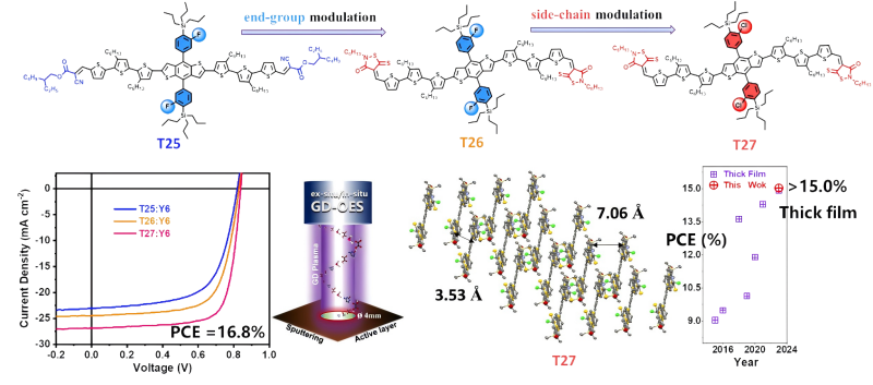 研究团队通过端基工程及侧链工程的策略对小分子给体逐步优化,分别设计合成了以氰基酯为端基的小分子给体T25,以罗丹宁为端基的T26以及以氯代为侧链的T27,并系统研究了端基及侧链工程对小分子给体理化性质、活性层生长机理和器件性能的影响,最终基于T27的小分子电池获得了高达16.8%器件效率,为二元小分子电池最高效率之一。且当其活性层膜厚超过300nm时,器件效率依然可以保持15%以上,这同时也是二元小分子电池厚膜最高效率之一。器件物理和形貌分析可知,基于T27:Y6的混合膜激子解离时间更短,受电荷复合及陷阱复合影响更小,载流子迁移率更平衡,分子π-π堆积更紧密,以及拥有更优异的互穿网络结构。此外,为了研究共混膜生长过程中给受体分子聚集及纵向分布情况,研究者首次将辉光放电发射光谱技术(GD-OES)应用于OSCs。通过原位与非原位测试结果表明,给受体结合度和薄膜生长速率与器件性能紧密相关。其中,相比于T26:Y6和T25:Y6两种共混膜,T27:Y6共混膜具有较高的给受体结合度与较慢的薄膜生长速率。这些结果均为T27:Y6的高性能提供进一步佐证。