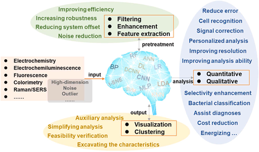 这篇综述深入探讨了将AI算法(包括分类、回归和聚类技术)集成到各种生化传感器中的最新进展。讨论涵盖了AI技术的代表性类型和功能,特别强调了它们在电化学、电化学发光、荧光、比色法和拉曼光谱学中的应用。为了激励其他研究人员使用AI技术合理有效地解决问题,我们精心概述了AI在各种上下文中的具体实现,包括辅助诊断、精确分析、性能增强和系统优化。通过详细探索人工智能如何在这些生化传感领域中发挥作用,阐明了应用的广度以及对传感技术的准确性和效率的潜在影响。最终,我们阐明了与生化传感器和AI融合相关的挑战和机遇。它不仅突出了商业化的光明前景,还解决了成功整合这些技术需要克服的障碍。该论文发表在中科院一区期刊Trac-Trends in Analytical Chemistry上,乐竞平台为唯一完成单位。