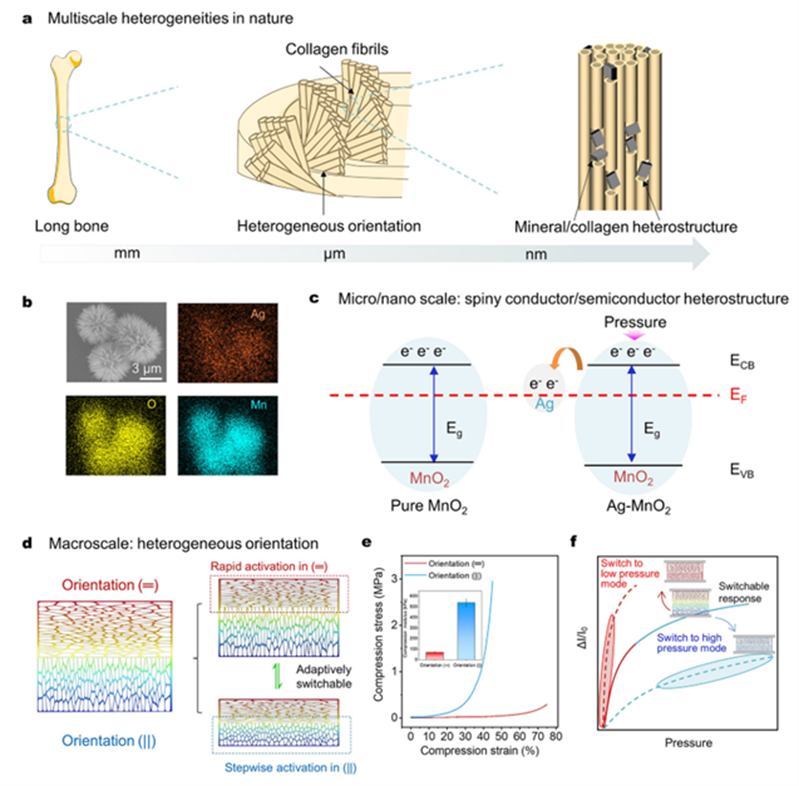 提出了一种基于多尺度异质性(微/纳米级异质结构和宏观异质细胞骨架)的压阻接口,可以动态适应特定的压力传感要求。多刺Ag-MnO2压阻微粒中的微纳米级异质结构能够实现较低的检测限制(0.008 Pa),并在高预载下高分辨率(0.0083%)的感知较小的压力增量。此外,具有异质取向的细胞骨架能够实现各向异性变形,即在低压下快速变形和在高压下逐步释放。与具有同质或单尺度异质接口的传感器相比,这种异质方向的设计提供了可切换的灵敏度和工作范围,能够区分复杂的压力源。该论文发表在自然指数期刊ACS Nano上,乐竞平台为第一完成单位。