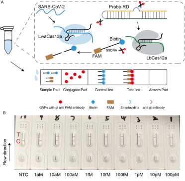 在COVID-19大流行期间,居家检测作为一种快速、便捷且低成本的诊断手段,在公共卫生防控中发挥了重要作用。然而,市售抗原检测试剂盒由于灵敏度不足,易导致假阴性结果;RT-PCR尽管灵敏度高,但需实验室环境支持,不适合家庭使用。刘翼振团队研发了一种结合CRISPR级联系统与侧向流免疫层析分析的新型检测方法,能够实现无扩增条件下的高灵敏度SARS-CoV-2检测,解决了现有检测方法的不足。
