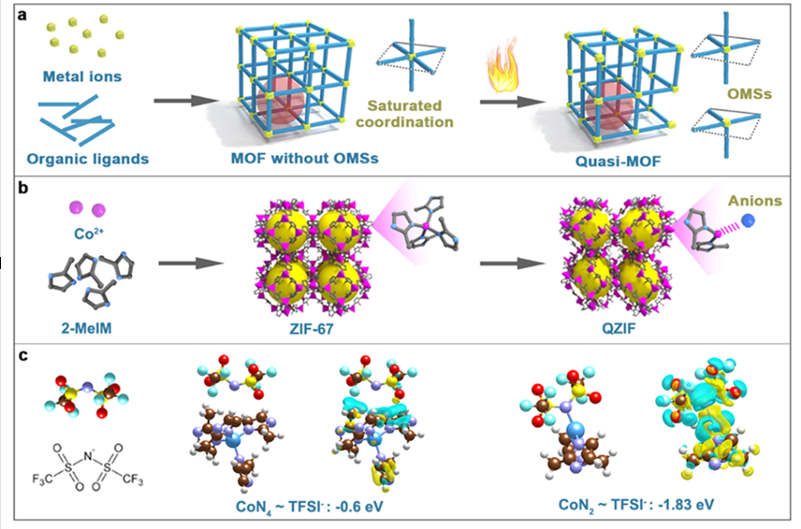 图1. a)准MOF的设计示意图。b) ZIF-67和QZIF的合成和配位结构。c) TFSI-在CoN4(ZIF-67)和CoN2(QZIF)上的吸附构型简化模型以及相应的微分电荷密度。绿色和黄色区域分别表示电荷密度降低(Δ𝜌< 0)和增加(Δ𝜌> 0).