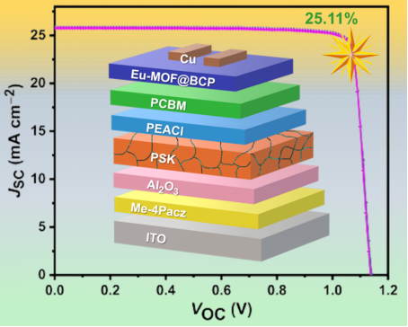 钙钛矿太阳能电池凭借器件效率优异、成本效益高、制备工艺扩展性强等优势,成为光伏电池研究领域的热点。目前,其单节电池效率已达到26.5%,但是,界面能带非理想弯曲及深能级的表界面缺陷严重影响电池效率和稳定性。本工作中,研究者首先在FACsPbI3基钙钛矿中引入硫氰酸铅(Pb(SCN)2)作为添加剂,增强晶粒尺寸、钝化晶界缺陷、提升载流子迁移率。其次,引入Al2O3纳米颗粒作为Me-4PACz空穴传输层的界面修饰剂,增强表面润湿性以促进高质量钙钛矿薄膜的生长,同时提升器件的环境稳定性。最后,创新性设计Eu-MOF修饰阴极缓冲层,能够部分渗入PCBM中,从而优化界面能带排列。该修饰的阴极缓冲层能同时钝化缺陷、增强电子传输、阻隔空穴反流。基于此,该倒置钙钛矿太阳能电池的效率提升至25.11%,电流密度和填充因子分别达到25.85 mA/cm2和85.11%。在65 °C 的环境空气中,相当于1个太阳光照的白光LED下老化1000小时后,最优器件仍可保持其初始效率的94%。本研究揭示的界面工程可为高效高稳定钙钛矿太阳能电池的研制提供一定的指导作用。