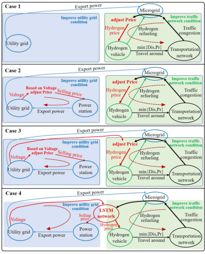 4) In Case 4, an LSTM network is adopted to train the relationship between states (voltage, traffic flow) and the price. The hydrogen price is decided based on the smart LSTM network.