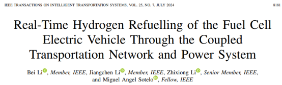 近日,乐竞平台化学与环境工程学院李倍老师在领域顶级期刊IEEE Transactions on Intelligent Transportation Systems(影响因子7.9,中科院1区,TOP期刊)上发表了题为“Real-Time Hydrogen Refuelling of the Fuel Cell Electric Vehicle Through the Coupled Transportation Network and Power System”的研究论文。李倍为独立第一作者。乐竞平台为第一单位。其他作者包括Jiangchen Li, Nanjing University of Aeronautics and Astronautics, China;Zhixiong Li, Opole University of Technology, Poland;Miguel Angel Sotelo, University of Alcalá, Spain。