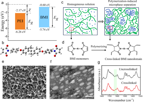 本研究采用聚合诱导微相分离(PIMS)策略,成功制备了高温全聚合物纳米结构电介质材料(PNDs),该材料具有良好的可扩展性和低成本优势。基于高玻璃化转变温度(Tg)的工程聚合物与热固性树脂单体在聚合交联过程中自组装形成的纳米结构多尺度界面,有效抑制了高温下电流的产生和输运,进而使得制备的PNDs展现出优异的高温电容性能。具体而言,聚醚酰亚胺(PEI)被选为高Tg工程聚合物,其高玻璃化转变温度(Tg ≈ 217 ℃)及良好的加工性为其在高温薄膜电容器中的商业应用提供了良好前景。选用的商用双马来酰亚胺(BMI)单体(2,2-bis-4-(4-马来酰亚胺-苯氧基)苯基丙烷)具有较大的带隙(Eg ≈ 5.74 eV)和低的电子亲和能(χ = 0.60 eV),因此能在与PEI接触时形成较高的电子注入屏障。此外,由于BMI和PEI分子结构中均含有双酚A和酰亚胺基团,使得二者具备良好的相容性。实验结果表明,自组装的纳米尺度多界面结构有效抑制了电荷的注入与激发。在高温和强电场条件下,漏电流密度降低了一个数量级以上,而在150 ℃的高温下,击穿场强提升了30%,显著优于纯PEI。该全聚合物纳米结构电介质材料在150 ℃下实现了7.1 J/cm³的放电能量密度和90%的充放电效率,超越了现有的聚合物电介质,并且其放电能量密度相比纯PEI提高了超过两倍。此外,与文献中报道的方法相比,本研究的薄膜加工过程更为简单、直接且成本低廉,为高性能、高质量电容薄膜的大规模生产奠定了基础。