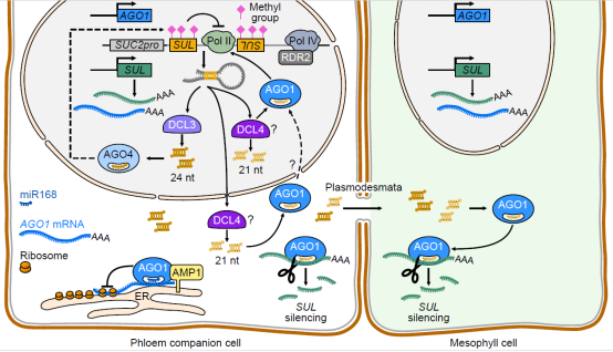 RNA 沉默通过 DNA 甲基化、组蛋白修饰、mRNA 切割或翻译抑制,在转录或转录后水平上对基因表达产生负向调节。植物small RNA主要分为miRNA和siRNA两大类。AMP1和AGO1 在miRNA介导的转录后基因沉默 (PTGS) 过程中发挥重要作用, 而其在siRNA生物发生过程中的作用还不清楚。