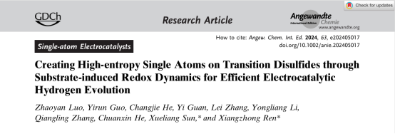 近日,乐竞平台化学与环境工程学院任祥忠教授团队在化学领域顶尖期刊《Angewandte Chemie》(影响因子16.6,中科院JCR 1区,TOP期刊)发表了题为《Creating High-entropy Single Atoms on Transition Disulfides through Substrate-induced Redox Dynamics for Efficient Electrocatalytic Hydrogen Evolution》的研究论文。乐竞平台罗兆艳助理教授为论文第一作者,乐竞平台任祥忠教授和加拿大西安大略大学孙学良院士为该论文共同通讯作者,乐竞平台为第一作者单位和第一通讯单位。
