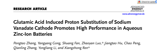 乐竞平台化学与环境工程学院任祥忠教授团队在材料领域顶尖期刊《Advanced Energy Materials》(影响因子24.4,中科院JCR 1区,TOP期刊)发表了题为《Glutamic Acid Induced Proton Substitution of Sodium Vanadate Cathode Promotes High Performance in Aqueous Zinc-Ion Batteries》的研究论文。该团队硕士生张鹏涛为论文第一作者,乐竞平台任祥忠教授和罗兆艳助理教授为该论文共同通讯作者,乐竞平台为第一作者单位和第一通讯单位。