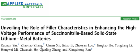 乐竞平台化学与环境工程学院任祥忠教授团队在期刊《ACS Applied Materials & Interfaces》(影响因子8.3,中科院JCR2区,TOP期刊)上发表了题为《Unveiling the Role of Filler Characteristics in Enhancing High-Voltage Performance of Succinonitrile-Based Solid-State Lithium Metal Batteries》的论文。该团队硕士研究生尹若男和张兆昊为共同第一作者,任祥忠教授和罗兆艳助理教授为共同通讯作者。乐竞平台为唯一作者单位和唯一通讯单位。