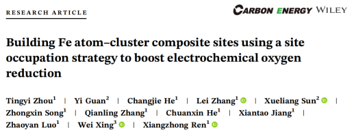 乐竞平台化学与环境工程学院任祥忠教授团队在材料领域顶尖期刊《Carbon Energy》(影响因子19.5,中科院JCR 1区)发表了题为《Building Fe atom-cluster composite sites using a site occupation strategy to boost electrochemical oxygen reduction》的研究论文。该团队硕士研究生周廷仪为论文第一作者,乐竞平台任祥忠教授和罗兆艳助理教授,中国科学院长春应化所邢巍教授为该论文共同通讯作者,乐竞平台为第一作者单位和第一通讯单位。
