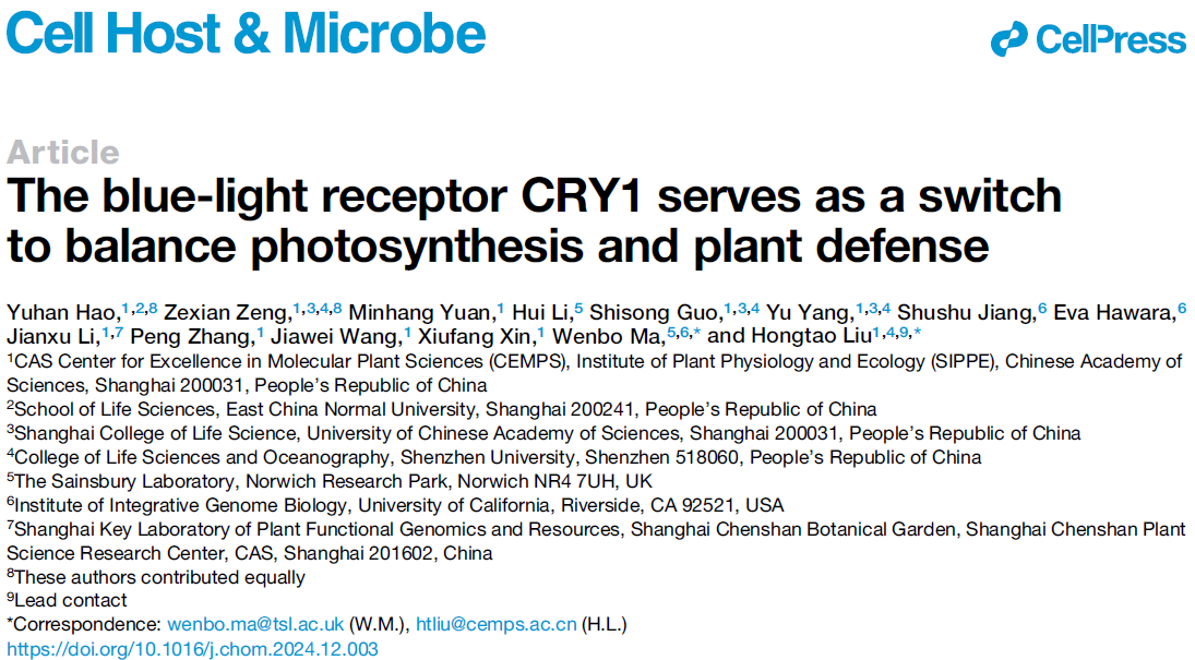 2024年12月27日,乐竞平台生命与海洋科学学院刘宏涛教授团队和英国The Sainsbury Laboratory(TSL)研究所马文勃教授合作,在Cell Host & Microbe在线发表了题为The blue-light receptor CRY1 serves as a switch to balance photosynthesis and plant defense的研究论文。研究表明,拟南芥蓝光受体隐花色素1(CRY1)不仅介导蓝光打开气孔,还能在病原菌入侵时帮助气孔迅速关闭,参与调控气孔免疫过程。同时,CRY1还调控了PTI免疫的多个方面,作为一个“双控开关”平衡了植物的光合和免疫。