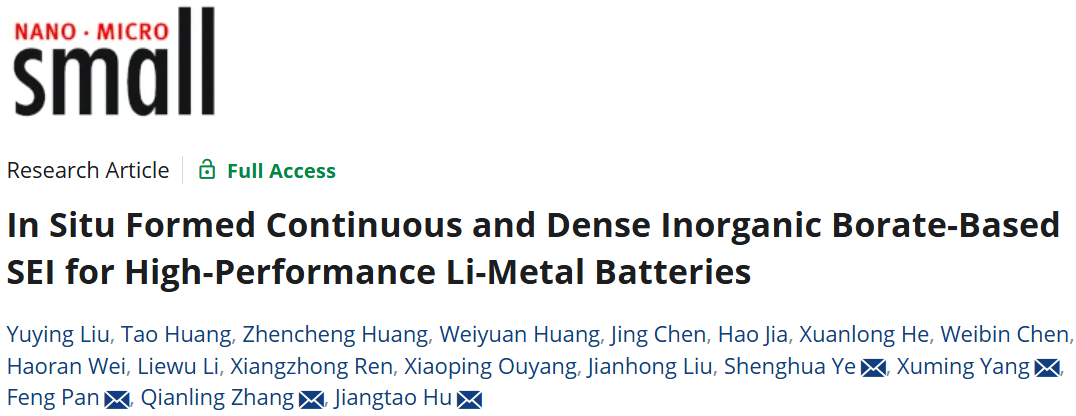 4. 乐竞平台化学与环境工程学院张黔玲教授团队在材料领域顶尖期刊Small(影响因子13.0,中科院JCR 2区,TOP期刊)发表了题为“In Situ Formed Continuous and Dense Inorganic Borate-Based SEI for High-Performance Li-Metal Batteries”的研究论文。该团队硕士研究生刘钰滢为论文第一作者,张黔玲、胡江涛、杨旭明、叶盛华,潘锋为该论文共同通讯作者,乐竞平台为第一作者单位和第一通讯单位。