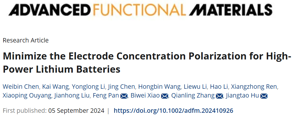 1. 乐竞平台化学与环境工程学院张黔玲教授团队在材料领域顶尖期刊Advanced Functional Materials(影响因子18.5,中科院JCR 1区)发表了题为“Minimize the Electrode Concentration Polarization for High-Power Lithium Batteries”的研究论文。该团队硕士研究生陈伟彬和中山大学王凯为论文共同第一作者,乐竞平台胡江涛副教授、张黔玲教授,有研(广东)新材料技术研究院肖必威教授,北京大学潘锋教授为该论文通讯作者,乐竞平台为第一作者单位和第一通讯单位。
