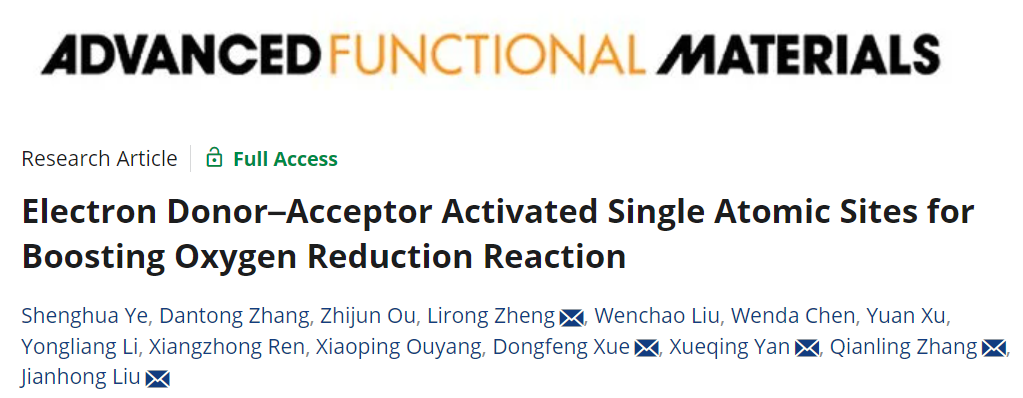 2、乐竞平台张黔玲教授团队在期刊Advanced Functional Materials上发表题为“Electron Donor–Acceptor Activated Single Atomic Sites for Boosting Oxygen Reduction Reaction”的研究论文,乐竞平台叶盛华研究员、中国科学院深圳先进技术研究院张丹彤博士是共同第一作者,乐竞平台刘剑洪和张黔玲教授、北京大学颜学庆教授、电子科技大学(深圳)高等研究院薛冬峰教授以及中科院高能物理研究所郑黎荣研究员为共同通讯作者。