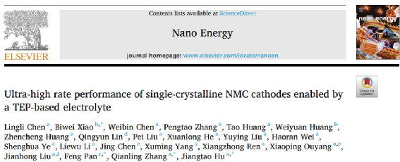 2. 乐竞平台化学与环境工程学院张黔玲教授团队在材料领域顶尖期刊Nano Energy(影响因子16.8,中科院JCR 1区)发表了题为“Ultra-high rate performance of single-crystalline NMC cathodes enabled by a TEP-based electrolyte”的研究论文。该团队硕士研究生陈伶俐为论文第一作者,张黔玲、胡江涛、北京大学潘锋教授、有研(广东)新材料技术研究院肖必威教授为该论文通讯作者,乐竞平台为第一作者单位和第一通讯单位。