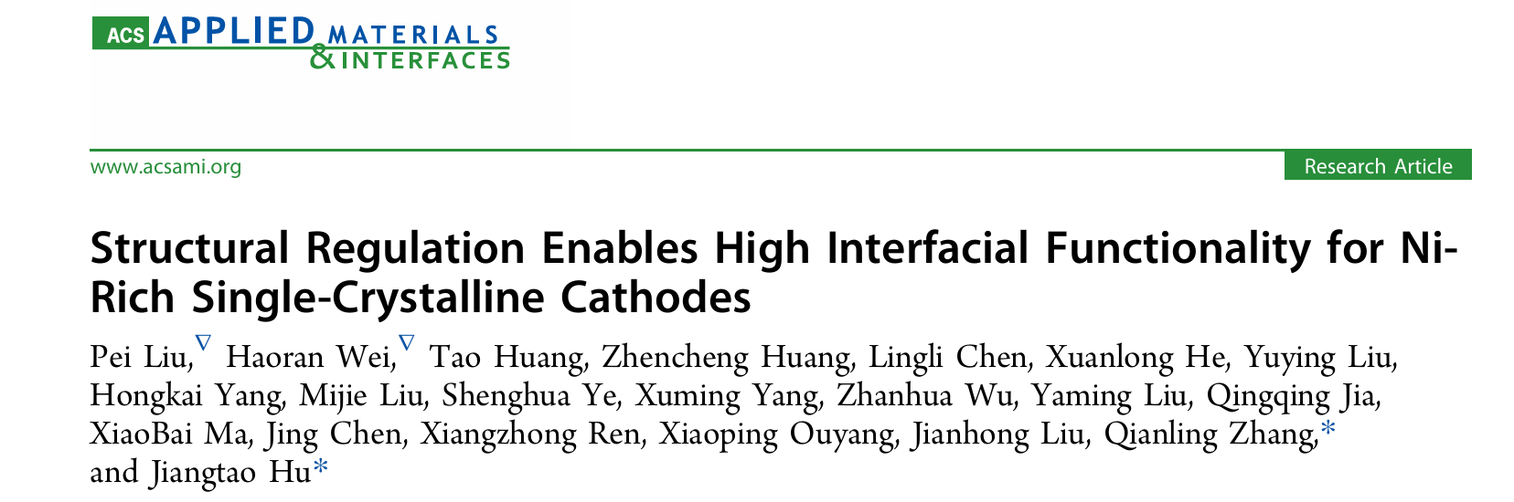 7. 乐竞平台化学与环境工程学院张黔玲教授团队在期刊ACS Applied Materials & Interfaces(影响因子8.3,中科院JCR2区,TOP期刊)上发表了题为“Structural Regulation Enables High Interfacial Functionality for Ni-Rich Single-Crystalline Cathodes”的论文。该团队硕士研究生刘珮和魏浩然为共同第一作者,张黔玲和胡江涛为共同通讯作者。乐竞平台为唯一作者单位和唯一通讯单位。