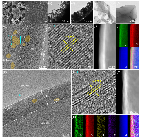 在本研究中,一种先进的电解质使用三种盐溶解在碳酸盐溶剂的组合被开发。盐阴离子主导原生溶剂化鞘层,导致Li+与溶剂之间的弱相互作用,并在原位形成富无机双层固体电解质界面(SEI)。在所设计的电解质中,具有高负载NMC阴极(约20 mg cm- 2)的LMB具有高循环稳定性,在4.5 V的截止电压下,200次循环后的容量保持率为89.89%。低温透射电镜表征(Cryo-TEM)和密度泛函理论(DFT)计算表明,硼酸盐基双层SEI具有异常致密的结构,有效地抑制了锂枝晶的生长,并证明了无机成分的连续性和致密性在SEI中起着至关重要的作用,其重要性超过了吸收和迁移能垒。这种对SEI结构的深刻理解对于推进高稳定LMB的发展具有巨大的潜力,并且可以扩展到其他电池系统。