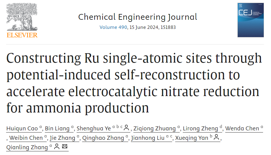 3、乐竞平台张黔玲教授团队在期刊Chemical Engineering Journal上发表题为“Constructing Ru single-atomic sites through potential-induced self-reconstruction to accelerate electrocatalytic nitrate reduction for ammonia production”的研究论文,乐竞平台曹慧群副教授和硕士研究生梁彬是共同第一作者,乐竞平台叶盛华研究员、张黔玲教授和北京大学颜学庆教授为共同通讯作者。