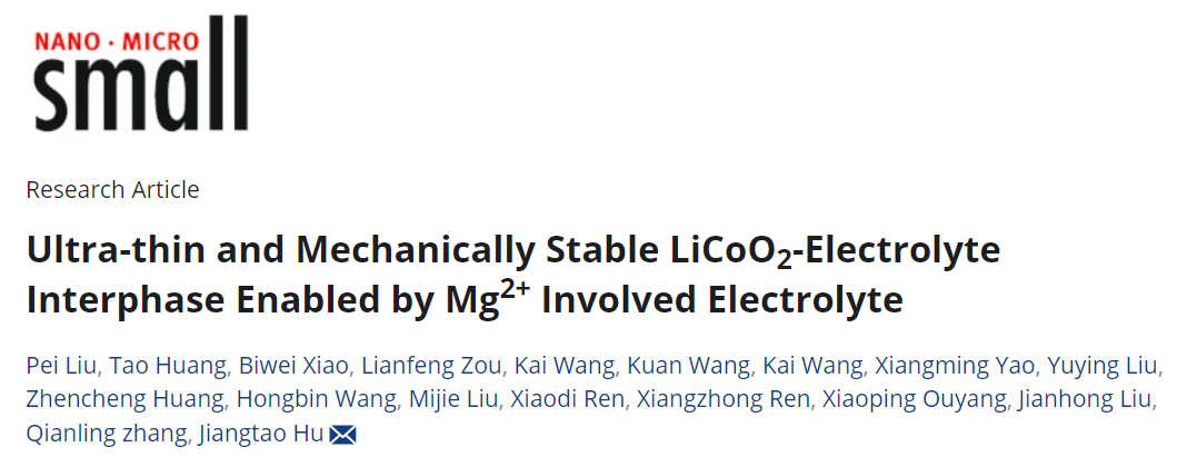 5. 乐竞平台化学与环境工程学院张黔玲教授团队在材料领域顶尖期刊Small(影响因子13.0,中科院JCR2区,TOP期刊)发表了题为“Ultra-thin and Mechanically Stable LiCoO2-Electrolyte Interphase Enabled by Mg2+ Involved Electrolyte”的研究论文。该团队硕士研究生刘珮和黄涛为论文共同第一作者,乐竞平台胡江涛副教授为该论文通讯作者。