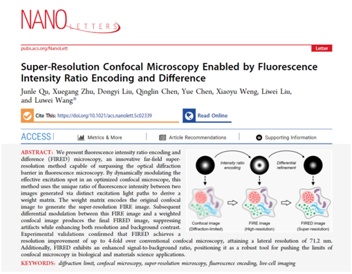 Junle Qu, Xuegang Zhu, Dongyi Liu, Qinglin Chen, Yue Chen, Xiaoyu Weng, Liwei Liu, and Luwei Wang*. Super-Resolution Confocal Microscopy Enabled by Fluorescence Intensity Ratio Encoding and Difference. Nano Letters, (2025).