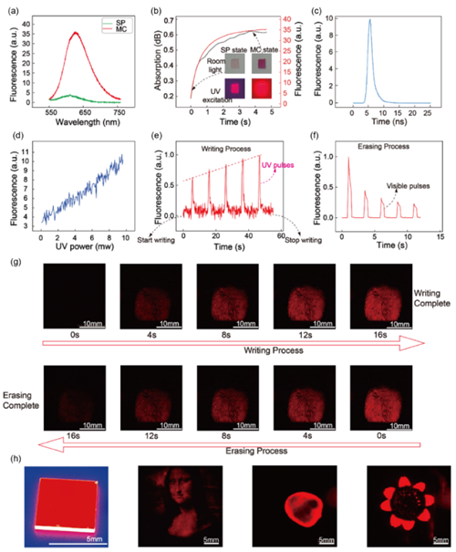图3.荧光强度与UV输入及MC浓度的关系,展示可编程、多值、快速响应的荧光特性。