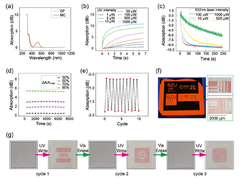 图2.SP–MC薄膜的光致变色行为及其可逆性、稳定性与分辨率表征。