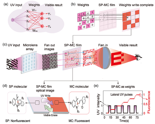 【机制与原理】如图1所示,本研究所构建的FMVM架构,基于一种可逆的光致变色体系——spiropyran(SP)/merocyanine(MC)分子对,在紫外与可见光照射下可发生可控、非挥发性转变。其中,非荧光态SP在UV照射下转化为荧光态MC,而在可见光下可逆恢复,构建出一种具有类记忆效应的光学权重材料。研究中,团队将SP分子均匀掺杂至甲基丙烯酸甲酯(MMA)基底中,制备出可精细控制的荧光响应膜。通过数字光处理(DLP)技术,将光学“权重”图案(如指纹分类权值)以特定紫外图样照射至薄膜,实现空间可编程的荧光强度调控,完成权重的写入与重构。