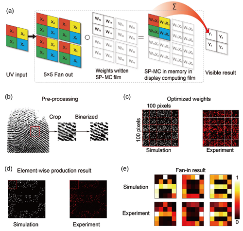 在计算过程中,输入光信号为紫外图案,其亮度代表输入向量,照射在已写入权重的SP-MC膜上后发生荧光发射,实现输入与权重的乘法操作。输出的荧光图案直接对应矩阵–向量乘法结果,并可由相机记录或直接用肉眼观察,从而实现可见光域的输出显现。这种架构无需电信号转换器,亦无需传统显示设备,实现了真正意义上的in-memory-display computing。