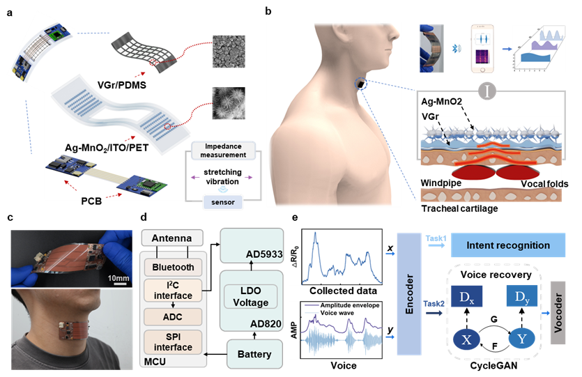 中风是全球导致长期残疾的主要原因之一,其中风后失语症会显著损害患者的沟通能力和社交互动能力。传统康复设备往往体积庞大、价格昂贵且不适合日常使用,尤其在言语康复领域,便捷有效的解决方案仍十分有限。为应对这一挑战,本研究推出了一款便携式可穿戴传感器系统,用于中风诱发失语症的康复治疗。该传感器融合柔性、超敏感且耐用的双传感器系统:基于Ag-MnO₂的海胆状纳米粒子压力传感器用于检测高频声带振动,垂直石墨烯/聚二甲基硅氧烷(VGr/PDMS)应变传感器则捕捉低频肌肉运动。该传感器集成于柔性电路中,采用编码器周期一致生成对抗网络(Cy-cleGAN)模型识别用户意图并重建语音,显著降低了对大规模标注数据集的依赖。实验结果表明,特定指令的意图识别准确率超过95%。通过客观与感知评估,重建语音的自然度显著提升,凸显其在改善中风患者日常沟通与互动方面的潜在临床应用价值。