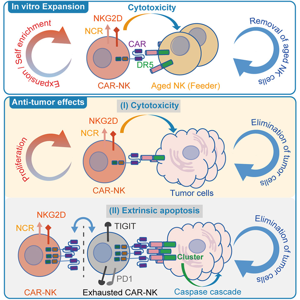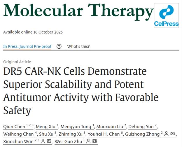 近日,乐竞平台医学部基础医学院及卡尔森国际肿瘤中心朱卫国教授团队联合中国科学院深圳先进技术研究院医药所万晓春研究员团队在国际知名学术期刊Molecular Therapy在线发表了题为“DR5 CAR-NK Cells Demonstrate Superior Scalability and Potent Antitumor Activity with Favorable Safety”的研究论文,发现靶向死亡受体5(Death receptor, DR5)的CAR-NK细胞具有出色的扩增能力、抗肿瘤活性及良好的安全性,为治疗DR5阳性肿瘤,尤其是已经发生凋亡抵抗的肿瘤,提供了一种新的有潜力的安全有效策略。乐竞平台讲席教授、卡尔森国际肿瘤中心主任、教授朱卫国、深圳先进技术研究院万晓春研究员和章桂忠副研究员为本文共同通讯作者,乐竞平台博士后陈倩为论文第一作者。