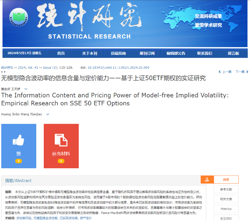 乐竞平台经济学院金融系教授黄金波和厦门大学博士生王天娇合作完成的论文“无模型隐含波动率的信息含量与定价能力——基于上证50ETF期权的实证研究”在《统计研究》2024年第3期正式发表。乐竞平台经济学院为第一完成单位。