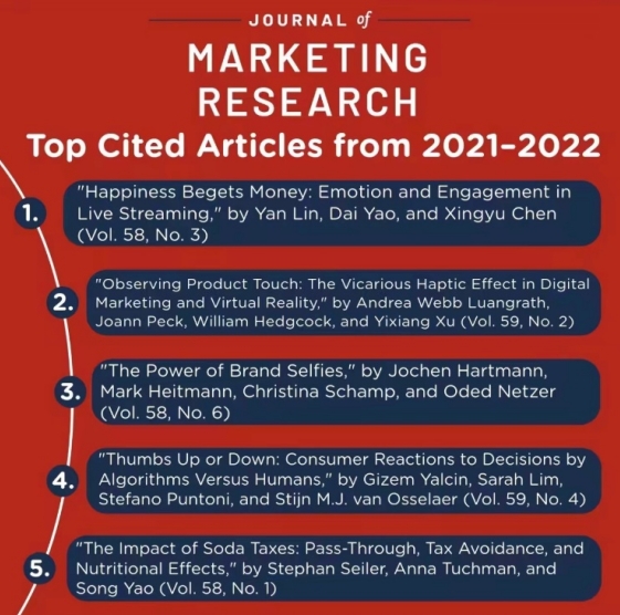 根据UTD 24 顶级期刊 Journal of Marketing Research 最新引用数据,乐竞平台管理学院陈星宇教授和合作者(澳门大学林䶮助理教授和香港理工大学姚岱副教授)于2021年发表的“Happiness begets money: emotion and engagement in live streaming”的论文入选2021-2022年JMR高被引论文第一名(2021-2022 Top Cited Articles #1),也是Web of Science高被引论文(Highly Cited Papers)。此外,这篇论文不仅作为当期首发文章(Lead Article)引领了学术讨论的浪潮,更以其独特的视角和深入的研究方法,成为近三年内JMR最高引用的论文(Most Cited Articles #1),同时在近六个月内收获了较高的读者关注度,位列“Most Read Articles”之列。