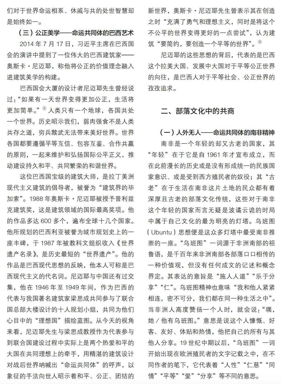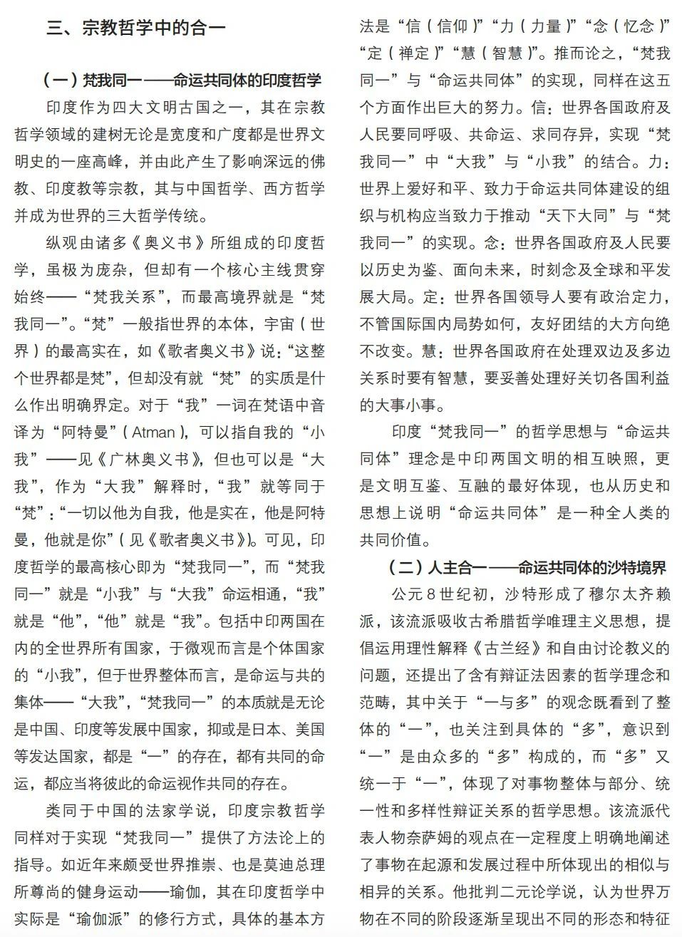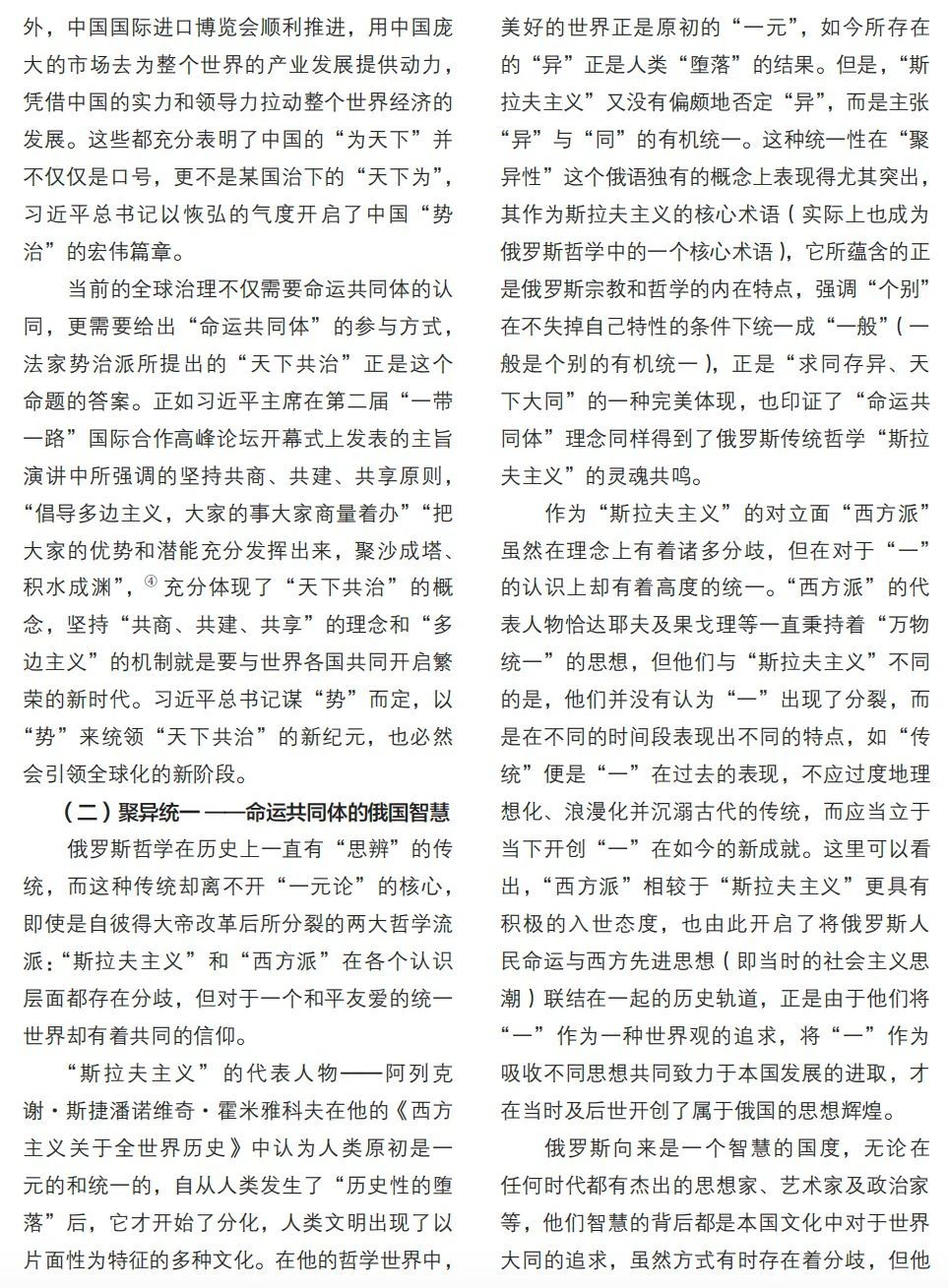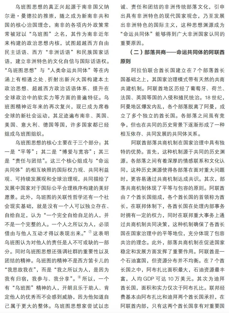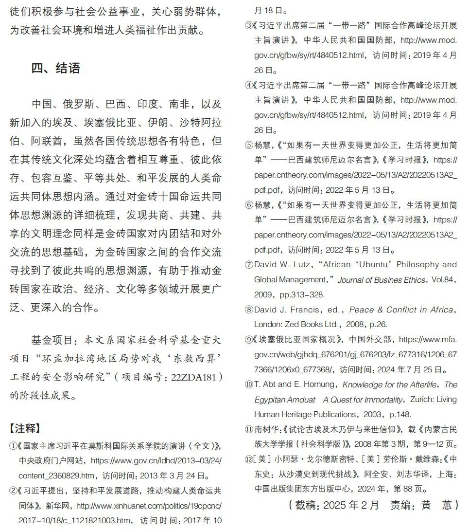 本文梳理金砖十国关于人类命运共同体理念的思想渊源,探讨各国传统文化中与该理念的契合点,为金砖国家交流合作提供思想基础。文章将十个国家命运共同体思想基础的来源分为三大类别:其一,根植于各国传统与现代思想中的共治理念,分别包含基于“天下共治”的中国理念、“聚异统一”的俄国智慧、以“公正美学”为内核的巴西艺术;其二,成长于部落文化中的共商理念,包含“人外无人”的南非精神、“部落共商”的阿联酋原则、“多元共存”的埃塞主张;其三,共生于宗教文化的合一理念,包含“梵我同一”的印度信仰、“人主合一”的沙特境界、“来世永恒”的埃及信念以及“政教合一”的伊朗景观。通过梳理发现,在金砖十国思想文化深处,均蕴含着人类命运共同体思想内涵,即共商、共建、共享理念。这既是金砖十国文明绵延存续的强大精神力量来源,也是金砖组织及“全球南方”合力推动全球治理变革的思想基础。