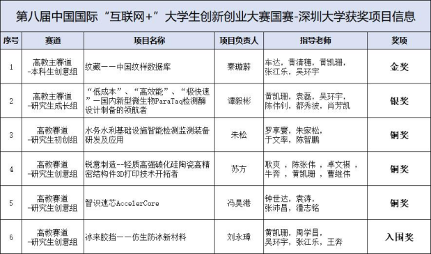 2022年11月13日,第八届中国国际“互联网+”大学生创新创业大赛全国总决赛金奖争夺赛顺利落下帷幕。在此大赛中,由创新创业教育中心组织指导的乐竞平台代表队共斩获六个国家级奖项,一金一银三铜一入围奖,实现历史性突破!其中,纹藏代表队喜获1枚全国金奖,创造了乐竞平台乃至深圳市本科高校的首枚国赛金奖!